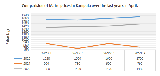 During the month of April, 2025 prices were much higher compared to 2024 prices, though lower than the 2023 prices in Kampala as demonstrated above . Good maize grain yields were realized during the 2nd season of 2024 especially in the Northern region due to better rain distribution in the same location. It is also true that the western region 2nd seasonal yield was highly affected by an extended dry spell especially around Rakai, Kyotera, Masaka production locations.